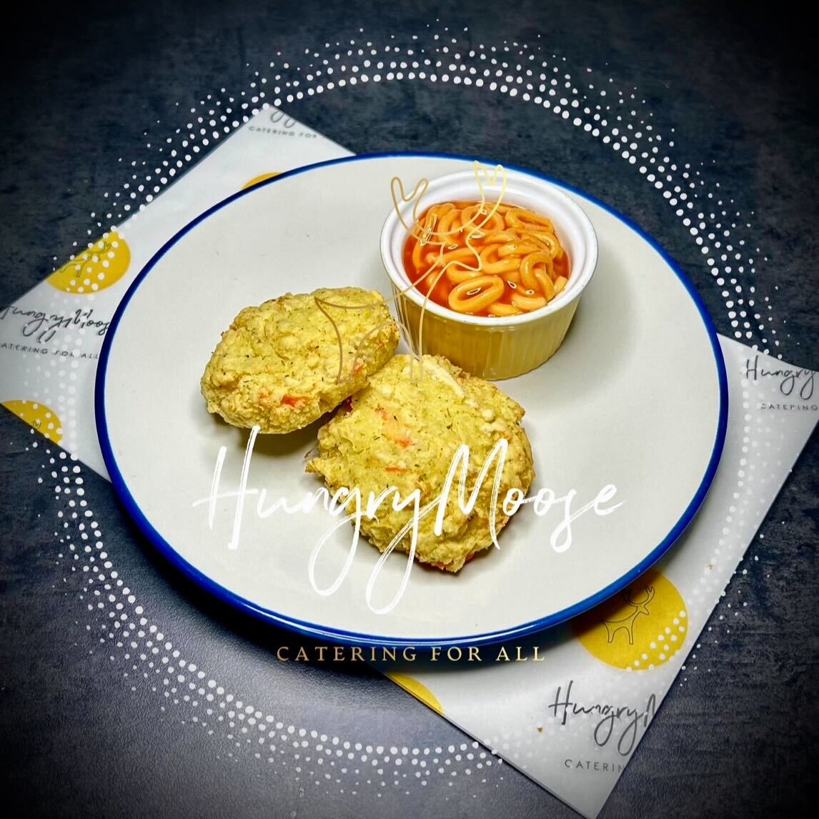 Homemade Vegetable Cakes With Spaghetti Hoops.